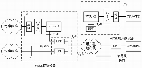 、 VTU-R 分別是位于局端和用戶端的VDSL收發(fā)器。業(yè)務(wù)分離器(Splitter ,包括HPF和LPF)將同一對電話銅纜上傳輸?shù)腣DSL與窄帶業(yè)務(wù)(或ADSL)