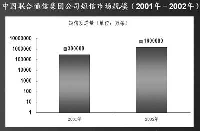 “從2001年的189億條增長到2002年的超過900億條,我國短信業(yè)務(wù)的增長率是移動用戶數(shù)增長率的3.4倍! 計世資訊分析師許牧說。