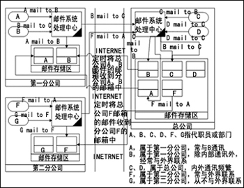 · F mail to A:F發(fā)郵件給A,此郵件經(jīng)由Internet發(fā)到總公司A的信箱中,因?yàn)橛蛎潜唤忉尩娇偣镜姆⻊?wù)器上,第一分公司的服務(wù)器會(huì)定時(shí)將總公司A信箱中的郵件取回,所以對(duì)A來講,F(xiàn)發(fā)來的郵件就好像是直接遞送到本公司的服務(wù)器上一樣。