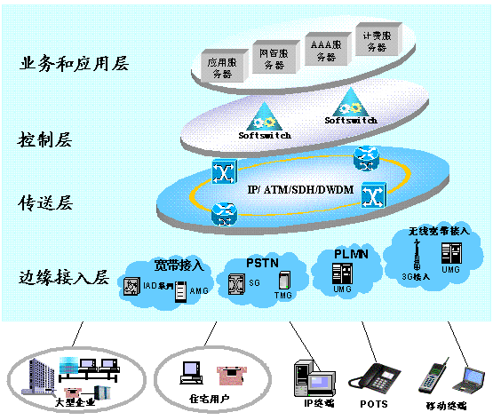 d)邊緣接入層:由各類媒體網關和綜合接入設備(IAD)組成,通過各種接入手段將各類用戶連接至網絡,并將信息格式轉換成為能夠在分組網絡上傳遞的信息格式。