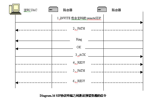 在上圖中實線的部分是SIP命令,虛線部分是RSVP消息