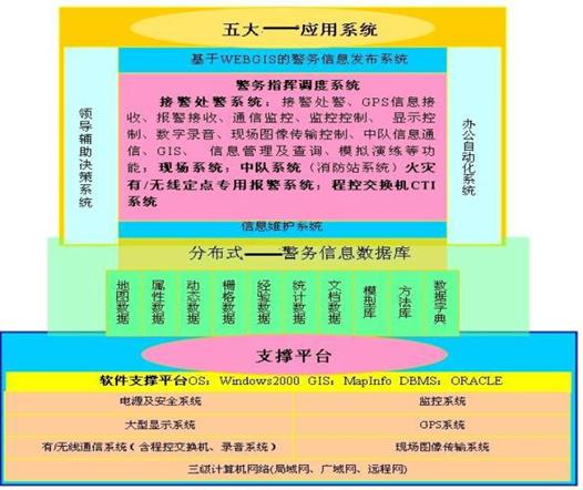 支撐平臺有計(jì)算機(jī)網(wǎng)絡(luò)系統(tǒng)、監(jiān)控系統(tǒng)、顯示系統(tǒng)、GPS系統(tǒng)、有/無線通信系統(tǒng)、圖像傳輸系統(tǒng)、電源及機(jī)房、軟件支撐平臺等。其中,計(jì)算機(jī)網(wǎng)絡(luò)系統(tǒng)包括指揮中心、二級指揮中心與移動指揮中心、業(yè)務(wù)執(zhí)行機(jī)構(gòu)(如:應(yīng)急中隊(duì)、派出所等)之間的三級計(jì)算機(jī)網(wǎng)絡(luò),即指揮中心局域網(wǎng)絡(luò)、業(yè)務(wù)機(jī)關(guān)網(wǎng)絡(luò)、與分支機(jī)關(guān)的廣域網(wǎng)絡(luò)、與移動指揮中心的遠(yuǎn)程訪問網(wǎng)絡(luò)。指揮中心與二級指揮中心、分支機(jī)構(gòu)、移動中心之間有語音通信、數(shù)據(jù)通信,指揮中心與移動中心有語音通信、數(shù)據(jù)通信(無線)、現(xiàn)場圖像傳輸;指揮中心與公安其它機(jī)構(gòu)通過撥號網(wǎng)絡(luò)訪問(內(nèi)網(wǎng)),指揮中心與普通老百姓通過撥號網(wǎng)絡(luò)訪問(外網(wǎng))。