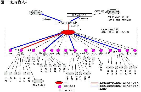 網(wǎng)通的客戶服務(wù)系統(tǒng)(1003呼叫中心)包括位于北京總部的總中心及其它全國30多個(gè)城市的分中心,全國范圍共有近200個(gè)接入點(diǎn)(覆蓋城市),共有200余座席,由總中心,交換機(jī)遠(yuǎn)端模塊接入點(diǎn)子中心及軟覆蓋接入點(diǎn)組成的三層架構(gòu)。參見下圖一《系統(tǒng)架構(gòu)》及圖二《組網(wǎng)模式》。