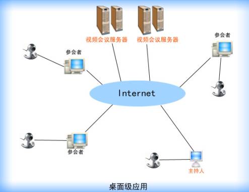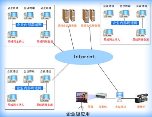 在企業(yè)級別的應用中,企業(yè)將服務(wù)器構(gòu)架在公司內(nèi)部,遠程用戶及局域網(wǎng)內(nèi)部的用戶均可登錄服務(wù)器,實現(xiàn)交互。企業(yè)級視頻會議系統(tǒng)的應用實際上就是將桌面級視頻會議與會議室級視頻會議系統(tǒng)有機的結(jié)合在一起,客戶端硬件外設(shè)可以按照以上的建議,根據(jù)各終端不同的需求進行配置。