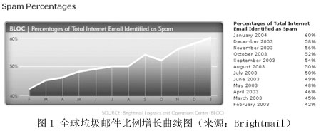 圖1來自著名的反垃圾郵件先鋒Brightmail公司的網(wǎng)站,顯示了最近12個月來,全球范圍內(nèi)垃圾郵件在所有郵件中所占比例的增長曲線圖。按Brightmail的統(tǒng)計結(jié)果,2003年3月,垃圾郵件在全球郵件總量中的比例是45%,其后的一年間,平均每個月增長兩個百分點。到了今年2月,這個比例已經(jīng)達(dá)到62%,也就是說,現(xiàn)在全球每5封電子郵件中就有3封是有害無益的垃圾郵件。