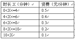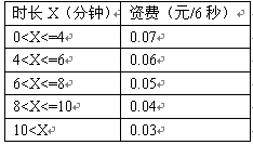 例3,國內(nèi)長途話費在時長不超過4分鐘的情況下,按0.07元/6秒收。怀^4分鐘但不超過6分鐘,統(tǒng)一按0.06元/6秒收;超過6分鐘但不超過8分鐘,統(tǒng)一按0.05元/6秒收。怀^8分鐘但不超過10分鐘,統(tǒng)一按0.04元/6秒收;超過10分鐘,統(tǒng)一按0.03元/6秒收取。