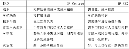 運(yùn)營商自然不會(huì)聽之任之,因此推出了IP Centrex業(yè)務(wù)與其相抗衡。由附表可以很明顯地看出,與IP PBX相比,IP Centrex的優(yōu)勢(shì)有:初期投入成本小、以辦公費(fèi)用方式容易控制現(xiàn)金流;無須對(duì)網(wǎng)絡(luò)、業(yè)務(wù)平臺(tái)進(jìn)行維護(hù);平臺(tái)規(guī)模與公司規(guī)模同步增長;具有對(duì)公網(wǎng)的開放性;辦公地點(diǎn)的任意性、易擴(kuò)展;使企業(yè)集中在主營業(yè)務(wù)領(lǐng)域;業(yè)務(wù)可擴(kuò)展性好。