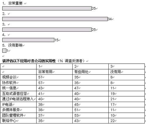 我們調(diào)查的企業(yè)中,有超過三分之二將在未來五年內(nèi)實(shí)現(xiàn)大多數(shù)或者所有部門向融合網(wǎng)絡(luò)的轉(zhuǎn)型。大部分企業(yè)采取按部就班的形式在某些特殊部門和業(yè)務(wù)開始部署。在融合應(yīng)用中,IP語音電話將在未來三年內(nèi)吸引大量投資;管理人士期望通過大幅削減公司內(nèi)部的通話費(fèi)用獲得早期的回報(bào)。在更廣泛的層面上,大多數(shù)管理者預(yù)計(jì),融合網(wǎng)絡(luò)對其企業(yè)的商業(yè)影響將會(huì)“非常重要”或者“重要”。