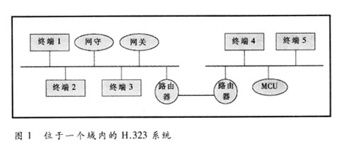 一個(gè)簡(jiǎn)單的基于H.323的視訊會(huì)議系統(tǒng)包括網(wǎng)守(GK)、網(wǎng)關(guān)(GW)、多點(diǎn)控制單元(MCU)和所有終端的集合。圖1是在常見的一種域類型中的H.323系統(tǒng)。