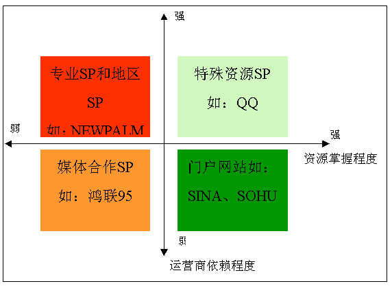 通常有風(fēng)險資本注入,主要通過本地接入獲得運營商推廣支持而產(chǎn)生收入,大多具20個省以上短信接入并在當?shù)卦O(shè)有市場人員,其它地區(qū)采用全網(wǎng)接入發(fā)展業(yè)務(wù),與運營商關(guān)系密切,業(yè)務(wù)主要以娛樂服務(wù)為主:華友、掌中萬維、靈通、空中網(wǎng);