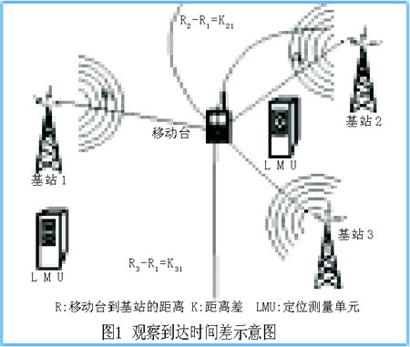 所示。通過測量得到的移動臺到多個基站距離的延時差后,移動臺的位置便可以由兩條雙曲線的交點得到。