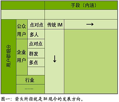 IT行業(yè)發(fā)展數(shù)十年,有一個(gè)共識,或是一種經(jīng)驗(yàn)結(jié)論,大約是:在用“老工具解決新問題”、“老工具解決老問題”、“新工具解決老問題”、“新工具解決新問題”四者中,一般最先者最善,也極討巧,最后者則最為事倍功半。觀IM發(fā)展趨勢,似乎介于“新工具解決老問題”、“新工具解決新問題”二者之間,就體現(xiàn)在表中兩個(gè)箭頭上,是以錢景堪憂。
