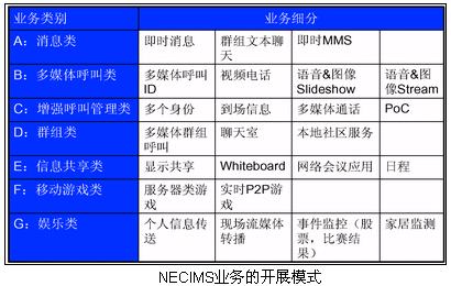 NEC的IMS系統(tǒng)已經(jīng)可以在SIP終端上實(shí)現(xiàn)這些業(yè)務(wù):PoC(手機(jī)一鍵通)、聊天、在線游戲、IM(即時(shí)消息)、Presence、多媒體呼叫、流媒體應(yīng)用和視頻消息等業(yè)務(wù)。