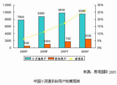 亞太領(lǐng)先的高科技智囊機(jī)構(gòu)-易觀國(guó)際最新推出的《固網(wǎng)增值業(yè)務(wù)研究系列報(bào)告-彩鈴彩話2005》中,易觀預(yù)測(cè),2005年國(guó)內(nèi)小靈通彩鈴用戶總數(shù)將達(dá)到500萬(wàn)戶,市場(chǎng)規(guī)模為1.7億元人民幣;到2008年,小靈通彩鈴用戶有望達(dá)到2,500萬(wàn)戶,市場(chǎng)規(guī)模將超過(guò)21億元人民幣。