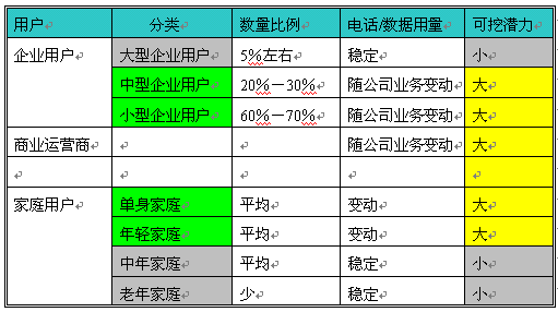 從以上表格可以清楚的顯示中小企業(yè)、商業(yè)運營商、年青用戶對電話和數(shù)據(jù)的使用不穩(wěn)定,這就意味者可發(fā)展、擴(kuò)大使用的可能性非常大,是企業(yè)增加收入的潛在用戶,但最主要的是如何提高這些用戶的使用呢?經(jīng)濟(jì)規(guī)律告訴我們?nèi)绻闾峁┑纳唐穼τ脩粲杏,同時價廉、物美,用戶是不會拒絕的。對于電話運營商來講就是提供給企業(yè)帶來方便、效率、節(jié)省成本、方便管理的服務(wù)的同時,提高有效接通率。