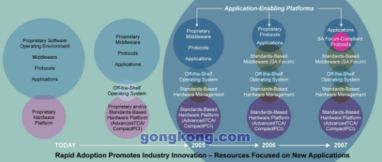 計(jì)算機(jī)和通信業(yè)已經(jīng)堅(jiān)定的向開(kāi)放標(biāo)準(zhǔn)演進(jìn)。例如,Linux已經(jīng)被作為OS大量采用,計(jì)算模塊已經(jīng)遵循各種規(guī)范標(biāo)準(zhǔn)來(lái)設(shè)計(jì),具有標(biāo)準(zhǔn)接口,如CPCI和ATCA。如果TEM繼續(xù)采用目前的方法集成計(jì)算機(jī)硬件和軟件模塊,全面標(biāo)準(zhǔn)化將是一個(gè)緩慢延進(jìn)的過(guò)程。下一步將是基于標(biāo)準(zhǔn)的硬件平臺(tái)管理,最終可能在本年代末,遵循SAF的中間件及其上運(yùn)行的應(yīng)用。