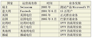 歐洲電信運(yùn)營商在部署IPTV時(shí),主要采用三重服務(wù)(triple-play)業(yè)務(wù)模式占領(lǐng)市場。該業(yè)務(wù)模式有助于電信運(yùn)營商與有線電視運(yùn)營商的競爭。目前,歐洲電信運(yùn)營商已準(zhǔn)備或開始IPTV的商業(yè)化進(jìn)程。