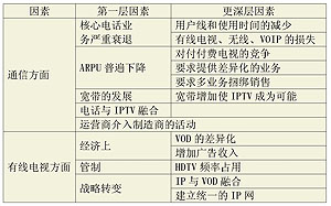 IPTV市場發(fā)展的驅(qū)動(dòng)力主要有兩個(gè)方面:一是通信方面的因素,二是有線電視方面的因素(詳見表4)。
