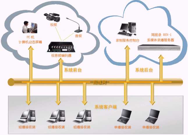 - 系統(tǒng)后臺(tái):連接在網(wǎng)絡(luò)上即可,接受REN-1服務(wù)器管理端發(fā)送來(lái)的系統(tǒng)管理、維護(hù)指令,并負(fù)責(zé)將系統(tǒng)前臺(tái)發(fā)送來(lái)的視頻、音頻、計(jì)算機(jī)動(dòng)態(tài)屏幕進(jìn)行實(shí)時(shí)錄制和直播,它包括:網(wǎng)易錄媒體中心(REN-1),它為系統(tǒng)的核心,主要完成視頻、音頻、計(jì)算機(jī)動(dòng)態(tài)屏幕的錄制和直播;