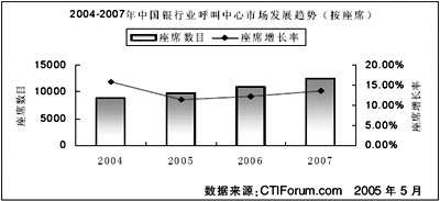 從1999年我國(guó)第一批銀行客戶服務(wù)中心建立至今,銀行客服中心已經(jīng)從飛躍發(fā)展期進(jìn)入到平穩(wěn)發(fā)展階段。根據(jù)CTI論壇《2005年中國(guó)呼叫中心產(chǎn)業(yè)發(fā)展研究報(bào)告》,截至2004年底,我國(guó)總共擁有客戶服務(wù)中心座席數(shù)18.4萬(wàn)個(gè),市場(chǎng)總規(guī)模達(dá)到227.1億元人民幣。其中銀行業(yè)客戶服務(wù)中心座席總數(shù)量為8800個(gè)左右,市場(chǎng)規(guī)模約46.2億元,分別占整個(gè)呼叫中心市場(chǎng)的4.78%和20.34%。