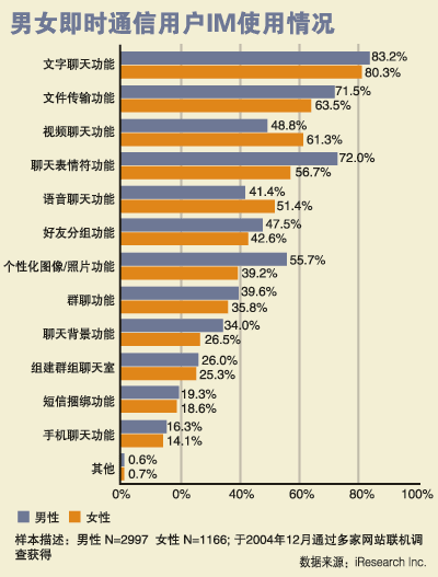 據(jù)IDC的相關(guān)預(yù)測,2007年美國無線SMS和IM用戶將分別達(dá)到7500萬和6300萬。到2007年年底,SMS和IM的利潤都將達(dá)到19億美元。價(jià)廉物美易于操作的IM文字短信方案與業(yè)已普及的SMS互動(dòng)發(fā)展,市場的主要?jiǎng)恿碜杂贗M。而據(jù)《芝加哥論壇報(bào)》表示,到2005年IM軟件使用將超過電子郵件。企業(yè)將用IM代替30%~40%的內(nèi)部電子郵件,而到2007年全球企業(yè)IM用戶將從目前的5200萬增加到3.49億。