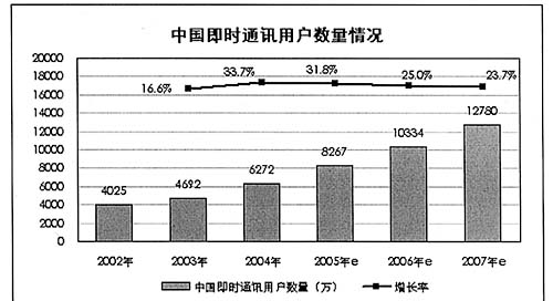 圖為:02年-07年中國即時(shí)通訊用戶數(shù)量及增長率 來源:艾瑞咨詢