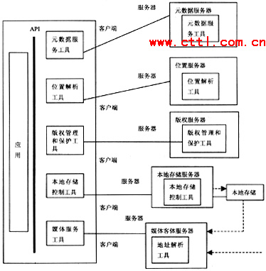 在DAVIC1.5AnytimeAnywhere文件中所規(guī)定的模型如圖2所示。在該圖中沒有描述任何與網(wǎng)絡(luò)相關(guān)的內(nèi)容。僅規(guī)定出在客戶端設(shè)備和服務(wù)器端設(shè)備中應(yīng)當(dāng)包含的功能模塊。即:元數(shù)據(jù)服務(wù)、位置解析、版權(quán)管理和保護、本地存儲控制、媒體服務(wù)。其基本思想為,在服務(wù)器端提供的所有功能。在客戶端設(shè)備中應(yīng)包含有相關(guān)的軟件工具。在業(yè)務(wù)的具體實施過程中,客戶端首先向服務(wù)器端請求幫助查找其感興趣的媒體內(nèi)容,由元數(shù)據(jù)服務(wù)器處理并返回相關(guān)信息。通過位置解析服務(wù)器來確定客戶端所選擇的媒體內(nèi)容所在的位置;經(jīng)過媒體管理和保護服務(wù)器的認(rèn)可:由本地存儲服務(wù)器向用戶提供媒體信息同時允許客戶端對媒體信息進行控制。