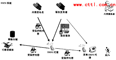 如圖4所示,DRM系統(tǒng)主要負(fù)責(zé)將內(nèi)容發(fā)布者發(fā)布的信息與版權(quán)發(fā)布者發(fā)布的信息組合起來將內(nèi)容變?yōu)槭鼙Wo的內(nèi)容,由版權(quán)客體提供使用規(guī)則,用戶在使用內(nèi)容時需要首先從DRM代理處根據(jù)使用規(guī)則獲得使用受保護內(nèi)容的密鑰,然后使用所獲得的密鑰對受保護的內(nèi)容進行解碼并使用。