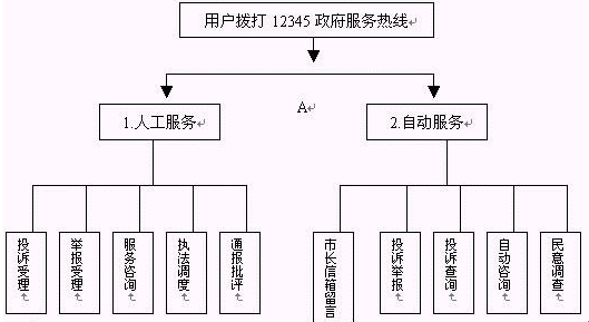當(dāng)用戶撥通"12345"電話并選擇自動(dòng)服務(wù)時(shí),聲訊臺(tái)自動(dòng)播放引導(dǎo)語"選擇市長信箱留言請(qǐng)按1,自動(dòng)投訴舉報(bào)請(qǐng)按2,投訴查詢請(qǐng)按3,服務(wù)咨詢請(qǐng)按4,民意調(diào)查請(qǐng)按5。