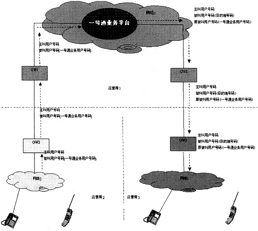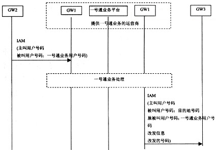 在圖1中,運營商2的用戶撥叫運營商1的一號通業(yè)務用戶號碼時,呼叫將通過運營商2的網(wǎng)關(GW2)、運營商1的網(wǎng)關(GW1)接續(xù)到運營商1的一號通業(yè)務平臺中。一號通業(yè)務平臺根據(jù)一號通業(yè)務用戶設置的接續(xù)規(guī)則,將呼叫翻譯到指定的目的地號碼。目的地號碼可能是運營商1的用戶,也可能是其他運營商的用戶。