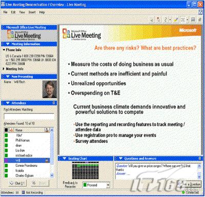 Microsoft Office Live Meeting實時會議:它使Web會議變得容易,它提供一個互動的Web空間進(jìn)行會議。在Web空間上面,參會人員能共享文件、音頻視頻流、以及協(xié)同工作。通過Live