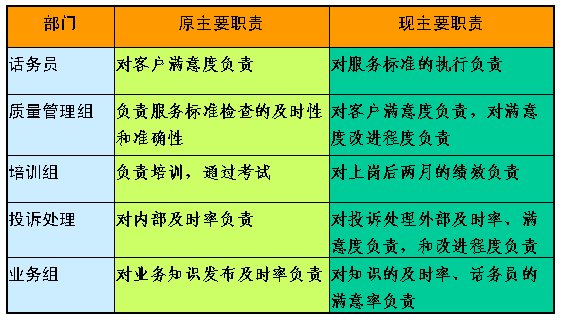 首先,要根據(jù)組織的目標(biāo)來確定我們需要哪些流程,即需要哪些流程才能保證組織目標(biāo)的實(shí)現(xiàn);其次,根據(jù)流程的需要,即為了保證流程的有效運(yùn)行,來劃分不同部分的職責(zé);最后,根據(jù)各部分職責(zé)的劃分來設(shè)置組織的架構(gòu)。如我們根據(jù)客服中心流程運(yùn)行的需要,對(duì)組織架構(gòu)和相關(guān)班組的主要職責(zé)進(jìn)行了調(diào)整,以保證流程的有效順暢運(yùn)行。如部分班組的主要職責(zé)調(diào)整如下: