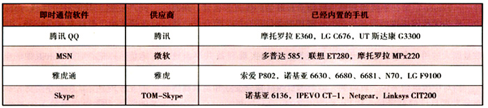 手機(jī)廠商、服務(wù)和內(nèi)容提供商都非常看好移動(dòng)即時(shí)通信市場(chǎng),已經(jīng)有大量的手機(jī)內(nèi)置了主流的即時(shí)通信軟件,例如采用Windows Mobile系列操作系統(tǒng)的智能手機(jī)都預(yù)置了MSN。雅虎、騰訊在推動(dòng)其“移動(dòng)QQ”業(yè)務(wù)時(shí),也努力說(shuō)服手機(jī)廠商內(nèi)置其軟件。內(nèi)置即時(shí)通信軟件的手機(jī)型號(hào)如表l所示。