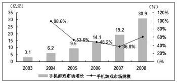 國內手機游戲市場在過去的幾年里呈現快速發(fā)展的趨勢。2004年增長率接近100%,2005年也有50%以上的增長。但最近兩年國內整個手機游戲市場隨著手機普及率的增速放緩也進入了盤整期。iResearch咨詢估計,從2005年至2007年,國內手機游戲市場的收入規(guī)模盡管仍然處于上漲趨勢,但年增長率逐年下降,2008年后隨著市場環(huán)境更加成熟理性,年增長率將會出現反彈,升至60%以上。