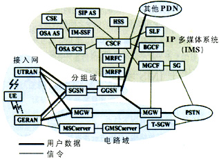 為了在IP平臺上支持豐富的移動多媒體業(yè)務(wù),3GPP在R5版本中引入了IMS。IMS基于SIP協(xié)議,疊加在分組交換(PS)域上。圖1是IMS體系結(jié)構(gòu)的示意圖。圖中粗線是用戶平面數(shù)據(jù)通道,細(xì)線是信令傳輸通道,可見其體系架構(gòu)采用的是控制與承載相分離的方式。IMS主要作為信令處理子系統(tǒng),用戶平面的多媒體數(shù)據(jù)由PS域的GSN通道承載。下面按照IMS的主要功能介紹相關(guān)功能實體。