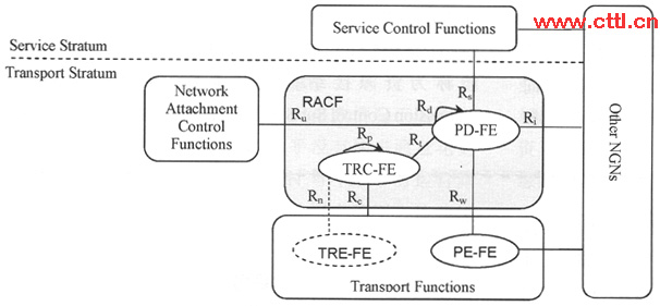 RACF由策略決策功能實(shí)體PD-FE和傳送資源控制功能TRC-FE兩個(gè)功能實(shí)體組成。PD-FE基于網(wǎng)絡(luò)策略規(guī)則、業(yè)務(wù)控制功能SCF提供的業(yè)務(wù)信息、網(wǎng)絡(luò)附著控制功能NACF提供的傳送層簽約信息,以及TRC-FE提供的資源接納決策結(jié)果,做出網(wǎng)絡(luò)資源接納控制的最后決策?梢曰诿總(gè)流對(duì)傳送層的策略執(zhí)行功能實(shí)體。PE-FE下發(fā)資源接納控制策略。TRC-FE負(fù)責(zé)收集和維護(hù)傳送網(wǎng)的拓?fù)浜唾Y源狀態(tài)信息,基于拓?fù)、連接性、網(wǎng)絡(luò)、節(jié)點(diǎn)資源的可用性以及接入網(wǎng)中的傳送層簽約信息等網(wǎng)絡(luò)信息控制資源的使用,提供傳送網(wǎng)絡(luò)接納控制的決策。PD-FE通過Rt參考點(diǎn)請(qǐng)求TRC-FE檢測(cè)或者決定所請(qǐng)求的媒體流路徑上的QoS資源。