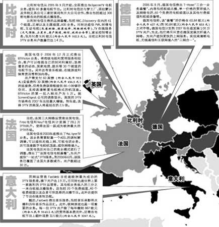 對(duì)于歐洲觀(guān)眾來(lái)說(shuō),IPTV(網(wǎng)絡(luò)付費(fèi)電視)就是他們未來(lái)的生活主畫(huà)面之一。他們只需每月交付30歐元(約合人民幣309元)到60歐元(約合人民幣618元)的費(fèi)用,便可在電視或電腦上選擇收看上百個(gè)頻道的電視節(jié)目。歐洲雖然缺乏強(qiáng)大的衛(wèi)星網(wǎng)絡(luò)作為技術(shù)支持,不過(guò)卻擁有多家實(shí)力雄厚的電信營(yíng)運(yùn)商,這些巨頭們擁有相同的興趣和市場(chǎng),正考慮是否聯(lián)合經(jīng)營(yíng),共同分食歐洲網(wǎng)絡(luò)電話(huà)電視市場(chǎng)這塊“大蛋糕”。