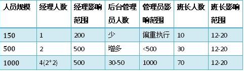 當(dāng)員工人數(shù)到達(dá)500人的時候,班長往往有30位左右。很多經(jīng)理已經(jīng)不能夠?qū)γ课话嚅L有足夠的了解,更不要說去認(rèn)識大部分員工。這個時候,經(jīng)理對班長的比例過寬,需要強(qiáng)化后臺管理員的角色。比如排班、績效、質(zhì)量管理(而不僅是評估)、信息分析(數(shù)據(jù)和報告)、行政、培訓(xùn)等工作中,這些管理輔助角色都在逐漸強(qiáng)化。而每一個后臺管理者可能成了經(jīng)理的直接下屬,他們起草的流程和制度,來由經(jīng)理決策。某種程度上說,他們比班長的影響力更大,因為班長還是影響著12-20人。有時候后臺管理員也決定了班長的時間精力分配,那是班長最寶貴的資源。那么誰是管理者呢?首先是經(jīng)理,其次是后臺管理員,最后才是班長。
