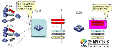 考慮到業(yè)務(wù)特性,上網(wǎng)業(yè)務(wù)通常需要對(duì)用戶進(jìn)行精細(xì)化管理,而對(duì)IPTV業(yè)務(wù)通常采用較粗獷的管理模式,因此我們建議通過如下方式來做VLAN規(guī)劃:對(duì)上網(wǎng)業(yè)務(wù),采用PUPV(每用戶一VLAN),對(duì)于IPTV/VOIP業(yè)務(wù),采用PSPV(每業(yè)務(wù)一VLAN),即同一園區(qū)內(nèi)的IPTV用戶采用同一VLAN,不同園區(qū)的IPTV/VOIP用戶采用不同的業(yè)務(wù)VLAN,在局端,通過靈活QINQ對(duì)上網(wǎng)業(yè)務(wù)的VLAN打外層標(biāo)簽,對(duì)于IPTV業(yè)務(wù)的VLAN不打外層標(biāo)簽。