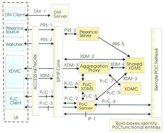 PoC業(yè)務(wù)需要外部實(shí)體配合提供,包括SIP/IP核心、共享XML文檔管理服務(wù)器(共享XDMS)、匯聚代理、在席服務(wù)器、在席信息源、觀察者、計費(fèi)實(shí)體和設(shè)備管理等,其中主要有: