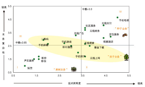 根據(jù)“業(yè)務(wù)復(fù)雜性—技術(shù)困難度”模型,可以清晰地看到一個(gè)業(yè)務(wù)的成功商用和業(yè)務(wù)復(fù)雜性與技術(shù)困難度密切相關(guān),如短信和彩鈴等復(fù)雜性與技術(shù)困難度都很低的業(yè)務(wù)是比較容易成功商用的,將這一類(lèi)業(yè)務(wù)歸類(lèi)為“果樹(shù)業(yè)務(wù)”,在第一象限(象限I)。還有一些業(yè)務(wù)如即時(shí)通信、整曲下載和無(wú)線搜索等業(yè)務(wù),已經(jīng)開(kāi)始快速增長(zhǎng)但是其用戶規(guī)模和收入量都還低于“果樹(shù)業(yè)務(wù)”,在業(yè)務(wù)復(fù)雜性與技術(shù)困難度坐標(biāo)中這類(lèi)業(yè)務(wù)處于4個(gè)象限交匯的中部區(qū)域(即圖中黃色區(qū)域),由于業(yè)務(wù)復(fù)雜性和技術(shù)困難度都會(huì)隨時(shí)間而減小,從而這一區(qū)域的業(yè)務(wù)會(huì)向第一象限演進(jìn),這類(lèi)業(yè)務(wù)稱為“苗子業(yè)務(wù)”,即在3年內(nèi)能夠成熟的業(yè)務(wù)。在坐標(biāo)系的右上角第四象限,即業(yè)務(wù)復(fù)雜性和技術(shù)困難度均較高的業(yè)務(wù),稱之為“種子業(yè)務(wù)”,這類(lèi)業(yè)務(wù)在短期內(nèi)很難快速成長(zhǎng)。