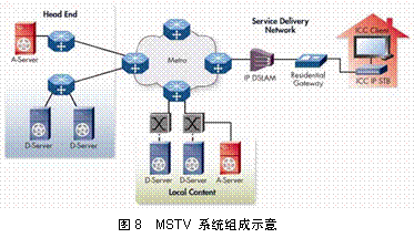 獲取服務(wù)器(A-Server,Acquisition Servers)是從本地或者遠(yuǎn)端的視頻源實(shí)時(shí)獲取內(nèi)容并提供視頻組播服務(wù)。分發(fā)服務(wù)器(Distribution Servers)是用于從運(yùn)營(yíng)商網(wǎng)絡(luò)中的多個(gè)采集點(diǎn)分發(fā)視頻內(nèi)容以保證視頻的快速傳送以及最快的頻道切換時(shí)間。在用戶側(cè)的IP機(jī)頂盒則運(yùn)行微軟公司獨(dú)有的軟件和協(xié)議以保證最優(yōu)的性能。