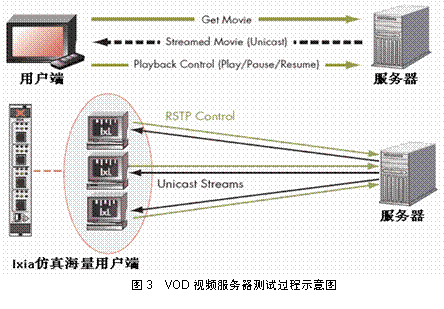 IXIA視頻測(cè)試方案可以很好地對(duì)VOD視頻服務(wù)器進(jìn)行支持,由于目前各個(gè)廠家對(duì)VOD業(yè)務(wù)所采用的RTSP控制協(xié)議進(jìn)行了不同程度和不同方式的修改和定制,要和VOD服務(wù)器進(jìn)行互通有一定的難度,IXIA根據(jù)這一特定的測(cè)試要求,可以對(duì)RTSP的流程進(jìn)行靈活定制和調(diào)整,支持RTSP各個(gè)命令信息交互的定制,支持的命令包括Describe,Setup,Play,Pause,Get Parameter,Set Parameter,Teardown等,這些靈活的特性可以保證IXIA能夠和業(yè)界幾乎所有的VOD服務(wù)器進(jìn)行互通并進(jìn)行性能測(cè)試。這是IXIA在視頻服務(wù)器測(cè)試方面非常重要的特性。目前,IXIA是Seachange公司視頻服務(wù)器認(rèn)證的測(cè)試工具?梢院蚑hompson,Bitband,Harmonic,Darwin以及Windows Media Server等業(yè)界常見(jiàn)的視頻服務(wù)器互通并提供性能測(cè)試。圖3是VOD服務(wù)器交換過(guò)程與IXIA進(jìn)行性能測(cè)試示意。