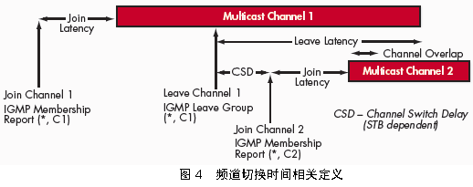 (6)頻道重疊時(shí)間:如果系統(tǒng)頻道切換采取接收到所請(qǐng)求頻道的組播包之后才停止原頻道的組播包的方式,則頻道重疊時(shí)間即指接收到所請(qǐng)求頻道的第一個(gè)組播包與接收到原頻道的最后一個(gè)組播包之間的時(shí)間間隔。