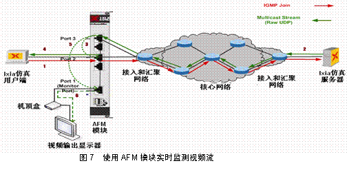 另外一種常見(jiàn)的應(yīng)用場(chǎng)景是對(duì)網(wǎng)絡(luò)中存在的IPTV組播流和單播流能夠進(jìn)行被動(dòng)實(shí)時(shí)監(jiān)測(cè)并能夠評(píng)估相應(yīng)視頻流的視頻質(zhì)量。IXIA獨(dú)特的視頻流提取模塊AFM支持該特性的測(cè)試(見(jiàn)圖6)。
