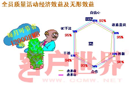 剛才說的全面質(zhì)量管理的話,實(shí)際上除了提高員工發(fā)現(xiàn)問題、解決問題的能力以后,還有很多的收益,包括員工的自信心,改善問題的意識(shí),創(chuàng)新的意識(shí),合作的意識(shí),還有他工作的熱情,還有QC的手法,可以看到我們自己也做了一個(gè)內(nèi)部調(diào)查,在改善前和改善后,我們整體的七個(gè)隱性、無形的資產(chǎn)都得到了一個(gè)很好的提升。