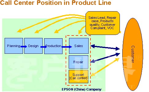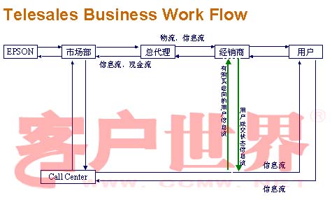 第一個(gè)就是我們的電話銷售,可以看到在開展這個(gè)電話銷售之前,愛普生所有的銷售都是渠道銷售,渠道銷售的特點(diǎn)是什么呢?就是所有的產(chǎn)品從愛普生,到我們的總代理,到我們的經(jīng)銷商,很多種渠道,然后到我們的用戶,所有的信息流、現(xiàn)金流是這么傳遞,那我們的物流也是相反的方向去傳遞。那有了電話銷售以后,大家可以看到,整個(gè)愛普生和我們的用戶之間大大縮短了距離,所有的用戶跟我們市場(chǎng)部門,通過呼叫中心是緊密地把它結(jié)合在一起。以前用戶的銷售信息如果傳遞到我們的總部的話,可以看到每一層傳遞都是有損失的,這么多的傳遞,最后傳遞到公司的話,你這個(gè)信息已經(jīng)是有很大的變化,現(xiàn)在通過這個(gè)Telesales,把用戶跟我們的總部結(jié)合在一起,我們也加強(qiáng)了跟用戶的溝通,購(gòu)買的意向都是把它提供到我們的經(jīng)銷商,由經(jīng)銷商及時(shí)地把這個(gè)產(chǎn)品成交的信息反饋到呼叫中心。