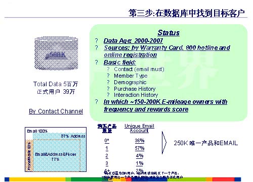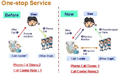 第一個(gè),我們利用這個(gè)信息改善了我們的服務(wù),第一個(gè)服務(wù)大家都知道,叫做一站式服務(wù)。我估計(jì)大家根本沒有我理解的透徹,一開始我們沒有推廣一站式服務(wù)之前,那我們的用戶有問題的話,打電話直接到我們的呼叫中心,假如說你要買一臺(tái)打印機(jī),我就說你是北京的用戶,給你提供一個(gè)電話就可以了,用戶就會(huì)打一個(gè)電話再去找我們的經(jīng)銷商,經(jīng)銷商會(huì)完成一個(gè)銷售?梢钥吹竭@個(gè)時(shí)候的呼叫中心,每一個(gè)請(qǐng)求用戶至少要打兩次電話,而我們呼叫中心的角色就是提供了一個(gè)信息。我們開展了這個(gè)一站式服務(wù)以后,用戶同樣要買一臺(tái)打印機(jī),用戶跟我們的呼叫中心取得聯(lián)系,那我們的呼叫中心通過我們內(nèi)部的系統(tǒng),傳遞到相關(guān)的部門,相關(guān)的部門來提供上門的維修或者上門的銷售,整個(gè)的請(qǐng)求結(jié)束了,那整個(gè)服務(wù)的監(jiān)控都是通過我們的呼叫中心監(jiān)控,可以看到同樣一個(gè)事情,那呼叫中心前后兩種角色的變化,第一同樣一個(gè)請(qǐng)求,用戶只需要打一個(gè)電話,而整個(gè)呼叫中心的角色是三種角色,第一種角色是信息的提供,第二種角色信息的傳遞和共享,第三種角色就是服務(wù)的監(jiān)控,所以可以看到通過一站式服務(wù),來豐富了呼叫中心工作的內(nèi)容,同時(shí)才有了我們下面要開展用戶信息的最大化利用。