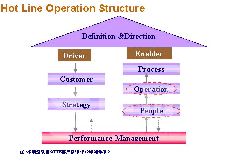 我不知道在座的各位有沒有見到過這個(gè)呼叫中心運(yùn)營(yíng)的結(jié)構(gòu)?也是選自CCCS客戶聯(lián)絡(luò)中心的標(biāo)準(zhǔn)體系,這個(gè)是推薦給大家,我希望大家能夠正確地、全面地理解,那作為一個(gè)呼叫中心的管理者,你的工作在什么,你的重點(diǎn)在什么?大家看到,我是把它叫做呼叫中心管理的金字塔,它由七個(gè)部分來組成。最基礎(chǔ)的部分呼叫中心的定義和方向,任何一個(gè)企業(yè)建立它的呼叫中心,沒有錢,想隨便找一個(gè)東西去建設(shè),它都有一個(gè)使命。作為一個(gè)呼叫中心來說的話,畢竟它最主要的驅(qū)動(dòng)力是什么?最主要來自于我們的客戶,呼叫中心為什么存在?是因?yàn)槲覀冇锌蛻舸嬖,所以我們的呼叫中心才?huì)存在。那么公司為什么要投資給你?是因?yàn)槲覀冇泄镜牟呗裕镜膽?zhàn)略需要我們呼叫中心去完成。作為一個(gè)呼叫中心你怎么樣去實(shí)現(xiàn)用戶對(duì)我們的期望,怎么樣去達(dá)成企業(yè)對(duì)你的期望。這個(gè)是我們的實(shí)現(xiàn)因素,如果你的呼叫中心多大多小,實(shí)際上所有的運(yùn)營(yíng),就是包括三個(gè)部分,第一個(gè)部分就是我們的過程管理;第二個(gè)部分就是我們的現(xiàn)場(chǎng)運(yùn)營(yíng)管理;第三個(gè)部分就是我們的人員管理。實(shí)際上無論你的驅(qū)動(dòng)因素,還是我們的實(shí)現(xiàn)因素中間的差距,就是我們要做的績(jī)效管理,所以通過這七個(gè)因素的金字塔圖的話,使大家對(duì)呼叫中心的管理有一個(gè)全面的理解。今天我跟大家分享管理的實(shí)踐最主要就是在過程管理、現(xiàn)場(chǎng)管理還有人員管理這三個(gè)部分。