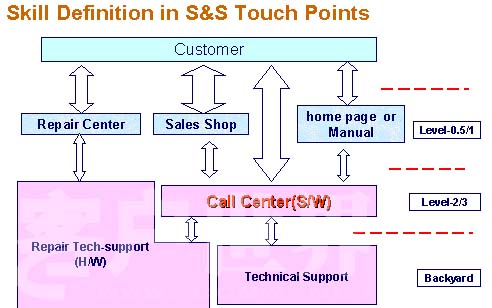 但是作為呼叫中心來說的話,畢竟人力的成本,還是人力的要求一定不同于這些其它部門的技能要求,大家可以看到,對(duì)于服務(wù)中心、店面,還有我們的手冊(cè),它技術(shù)的定位實(shí)際上定位到Level0.5—1,也就是我們的呼叫中心在它的窗口里面,整個(gè)呼叫中心的定位是高于服務(wù)中心、店面和手冊(cè)的。對(duì)于呼叫中心來說是作為后臺(tái),也就是說如果用戶出現(xiàn)了問題以后,希望用戶去閱讀我們的手冊(cè),去尋找我們的服務(wù)中心,去尋找我們的店面,再有問題的話,也可以直接通過我們的呼叫中心進(jìn)行了解。通過這個(gè)圖的話,實(shí)際上使你感覺到你的呼叫中心在很多的窗口里面,它的定位是不同的。舉個(gè)例子來說,移動(dòng)集團(tuán)都有一個(gè)10086的呼叫中心,實(shí)際上還有很多的店面,它的營(yíng)業(yè)廳,那對(duì)于呼叫中心來說,公司有沒有定位,營(yíng)業(yè)廳的營(yíng)業(yè)人員,技術(shù)的定位在什么地方?與10086的技術(shù)定位到底有沒有區(qū)別?實(shí)際上弄清楚以后,如果解決不了問題的話,怎么升級(jí)的一個(gè)過程。剛才這個(gè)圖是在整個(gè)公司的集團(tuán)里面去定義呼叫中心的一個(gè)定義。